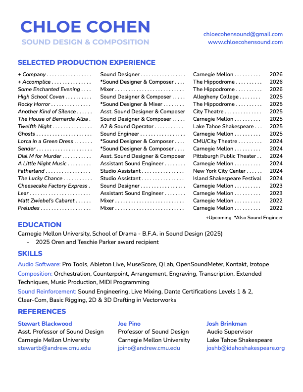 Hi, I’m Chloe! I’m a sound designer and composer from Texas who recently graduated from Carnegie Mellon University’s School of Drama with a BFA in Sound Design. Along with my sound curriculum, I took many music classes in my time at CMU and enjoyed singing in the choir. I have experience as a sound designer, sound engineer, mixer, composer, songwriter, and music producer.